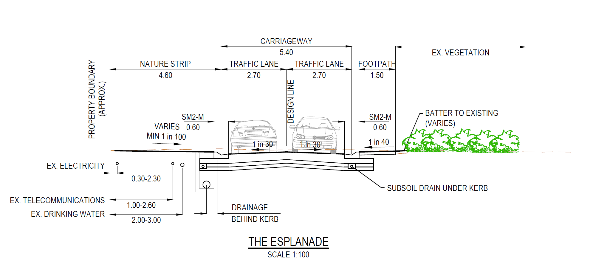 The functional layout plans for the project can be viewed here. A cross section of the road design is shown below.