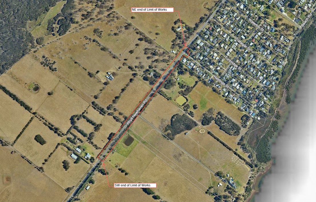 - The works area of the Rhyll Newhaven Road will be kept opened during the project duration with traffic controllers at site and single lane closures adopted with contra flow traffic. Please refer to the site location plan below.